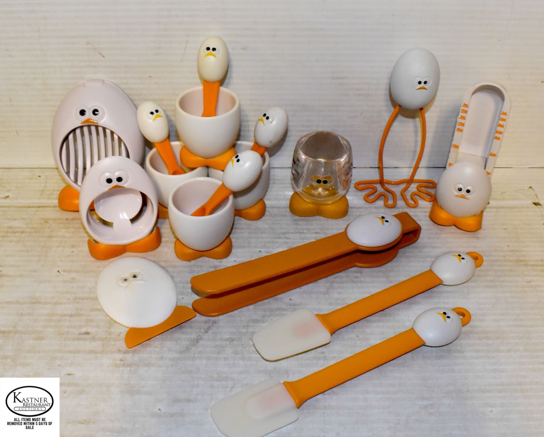 BIN OF ASSORTED EGG THEME EGG ACCESSORIES