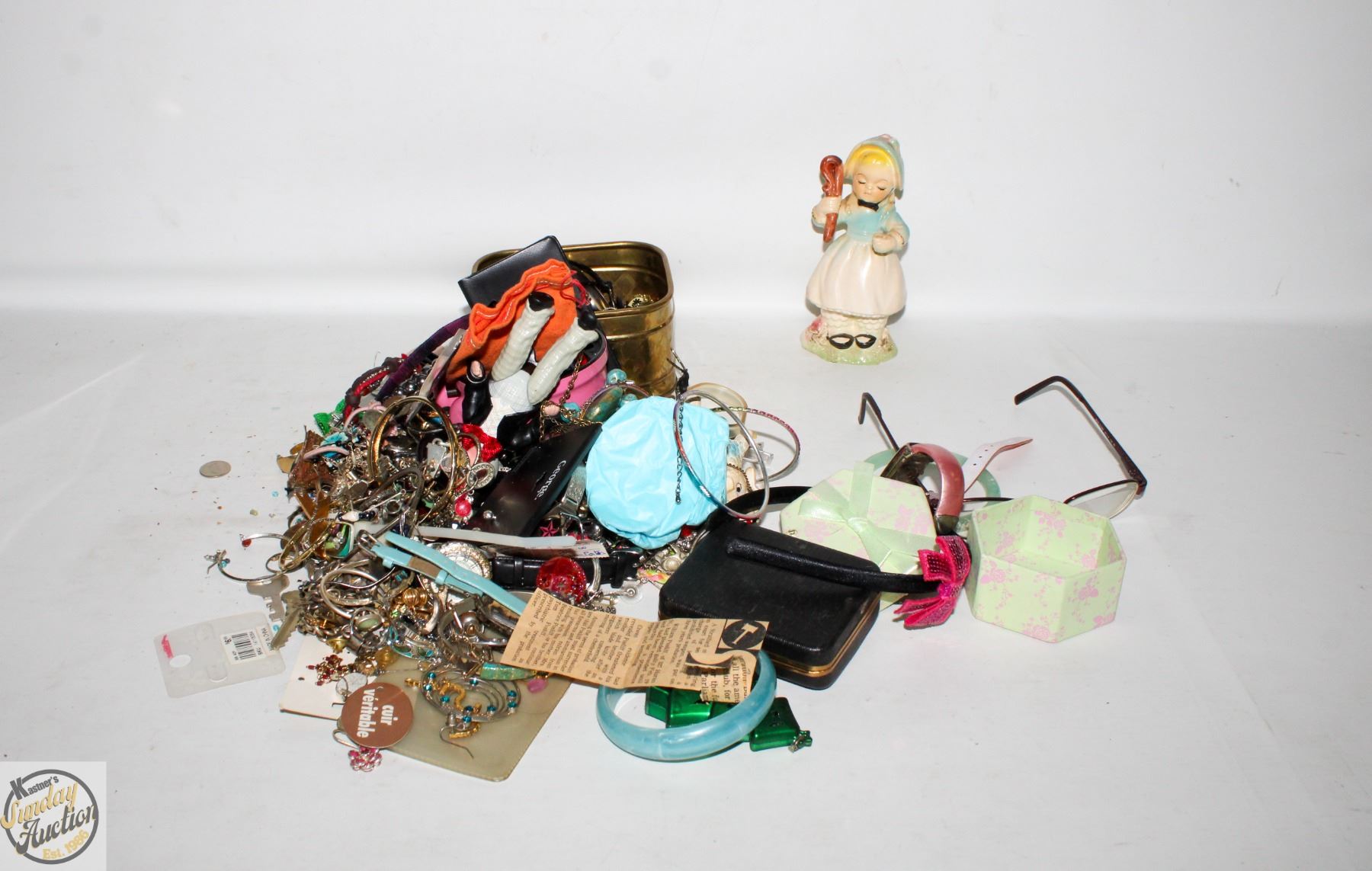 BIN OF ASSORTED JEWELRY & FIGURINES