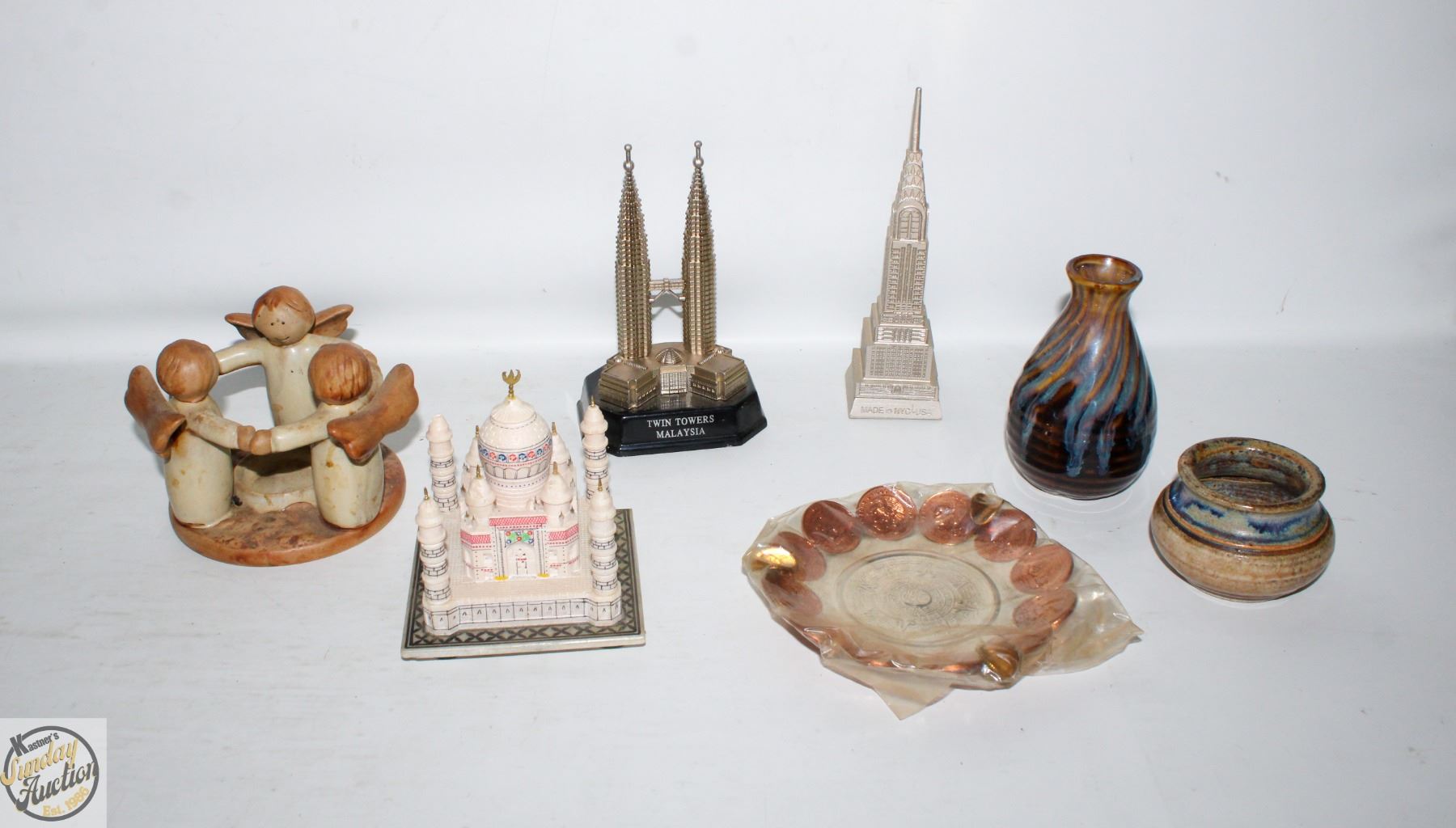 BIN OF ASSORTED ORNAMENTS INCL: MINI BUILDINGS,