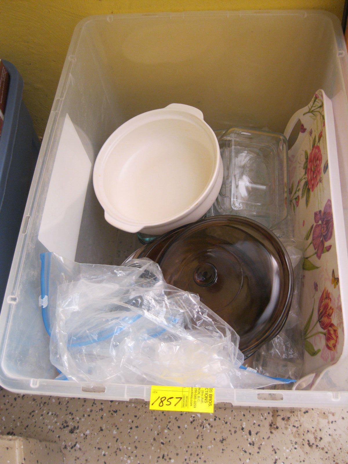 BIN OF ASST. GLASS BAKING DISHES, CUTLERY, ETC.