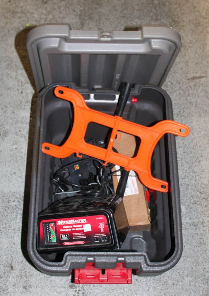 BIN OF BATTERY CHARGER, HITCH, TIMERS