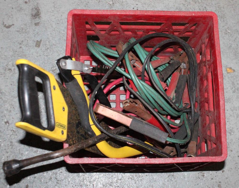 BIN OF BOOSTER CABLES & SAWS