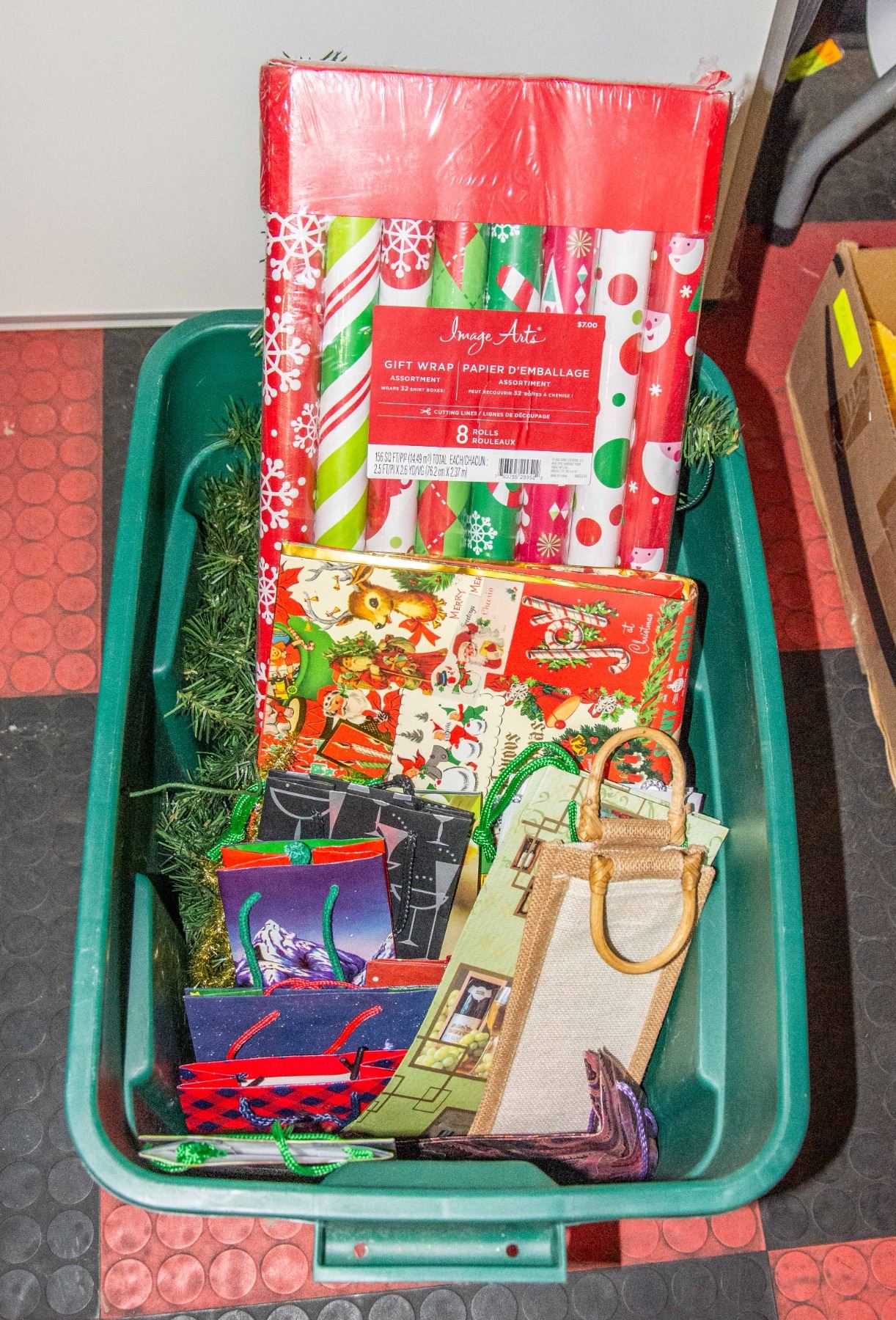 BIN OF CHRISTMAS PAPER, GARLAND AND BAGS