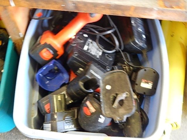 BIN OF CORDLESS DRILLS, BATTERIES AND CHARGERS