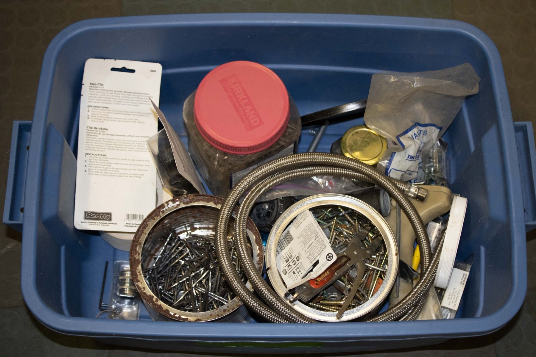 BIN OF HARDWARE, NAILS, BRAIDED HOSE ETC