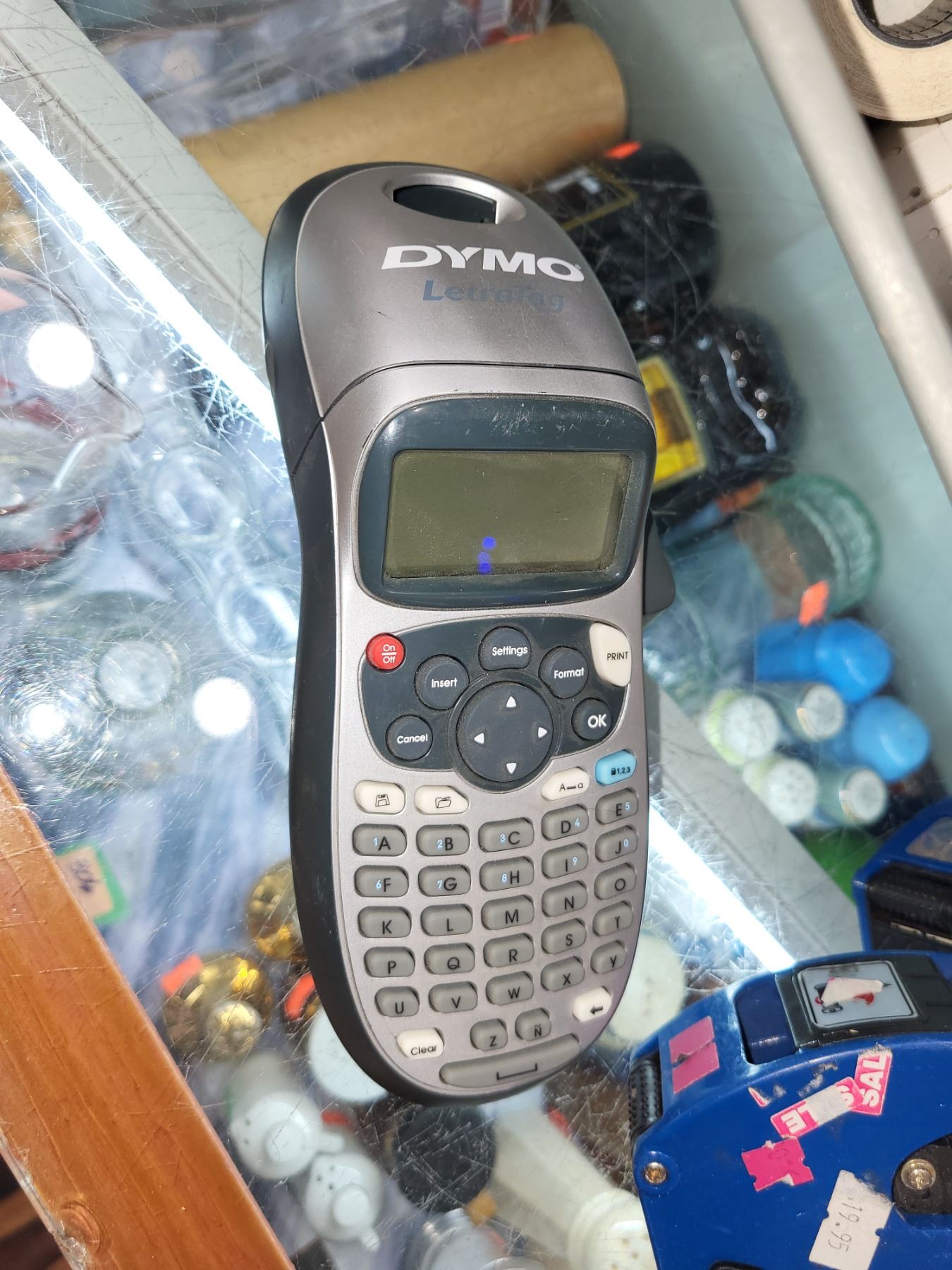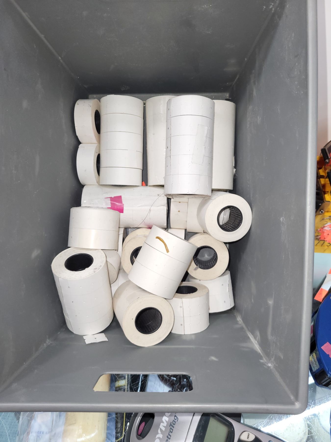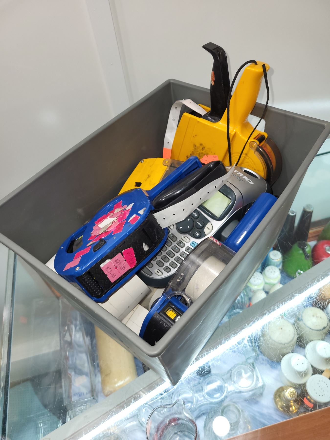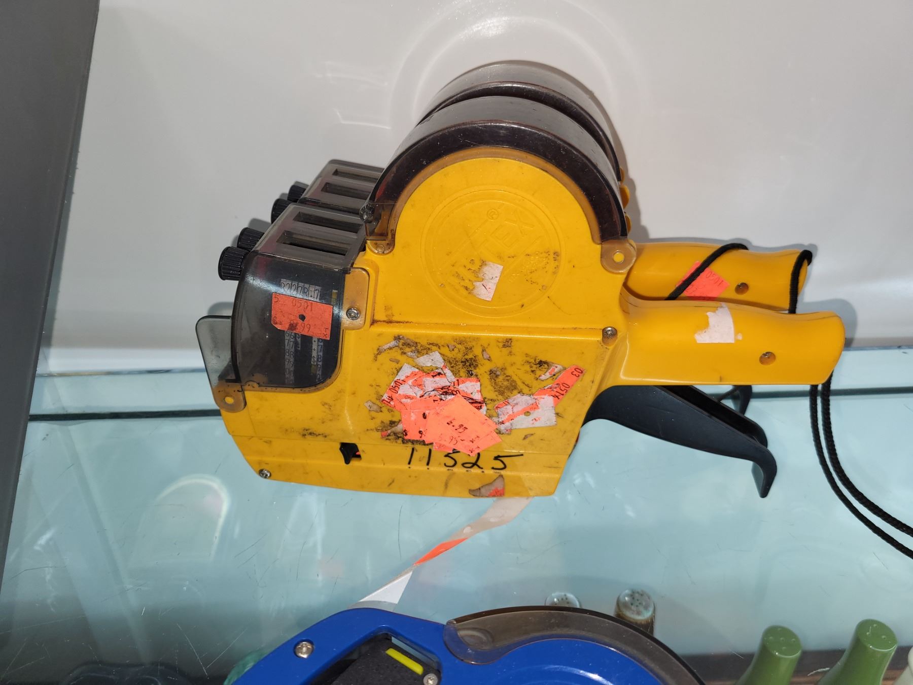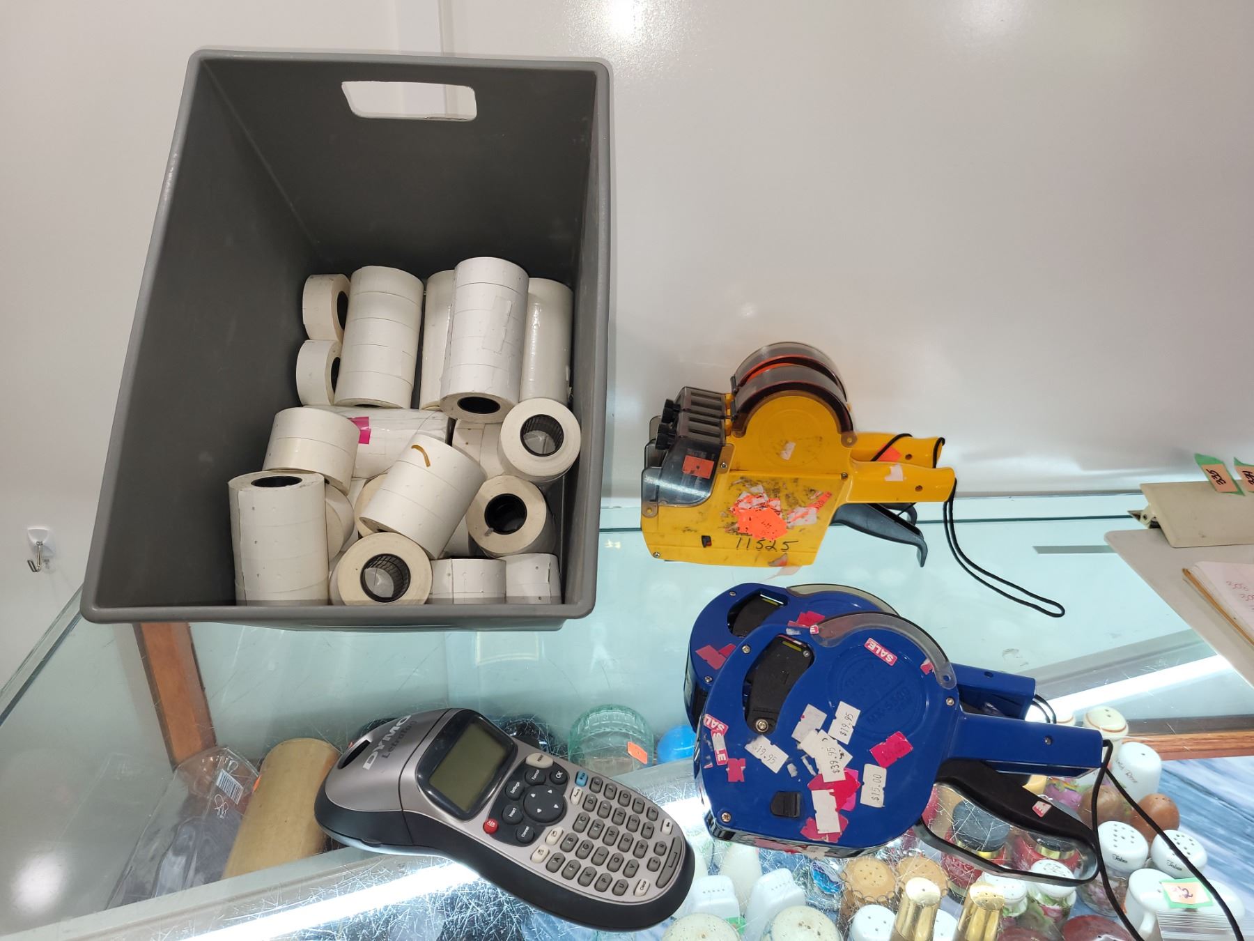 BIN OF PRICING GUNS, STICKERS AND LABEL MAKER