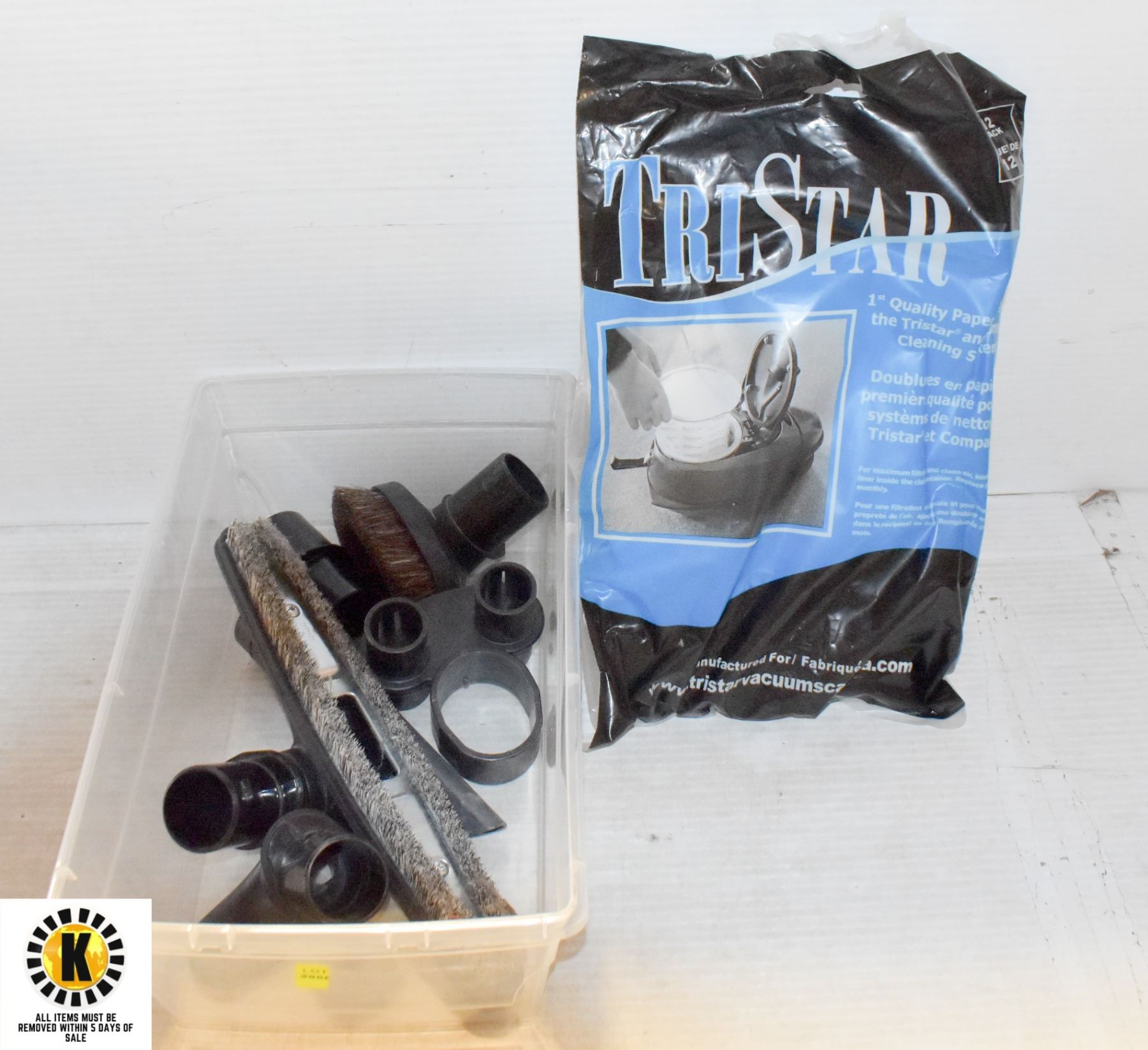 BIN OF TRI STAR VACUUM BAGS & ATTACHMENTS