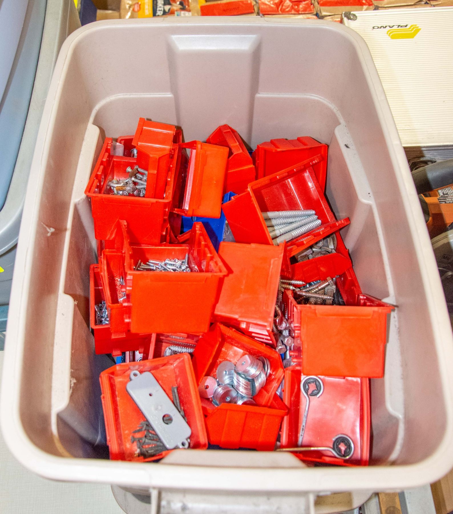 BIN OF VARIOUS BOLTS, SCREWS AND WASHERS