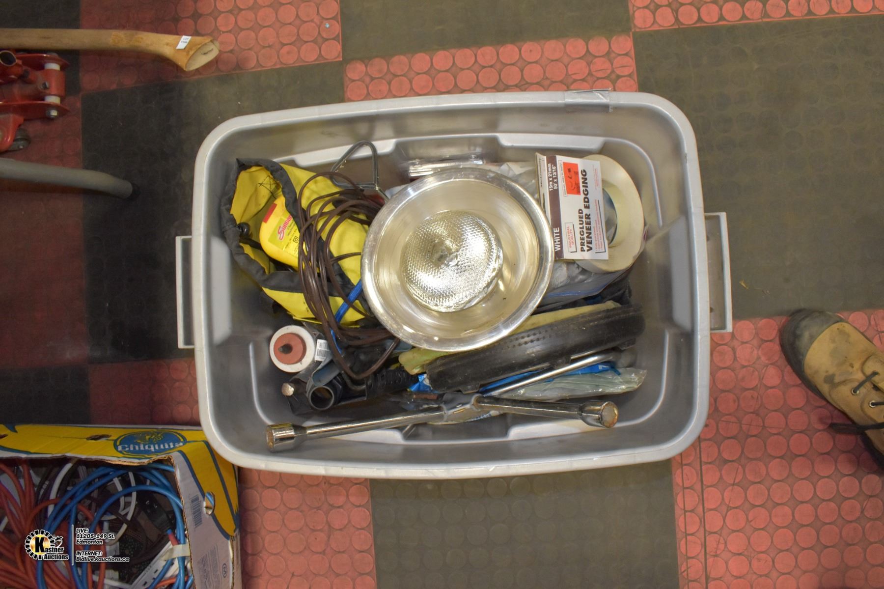 BIN OF VARIOUS TOOLS AND SUPPLIES