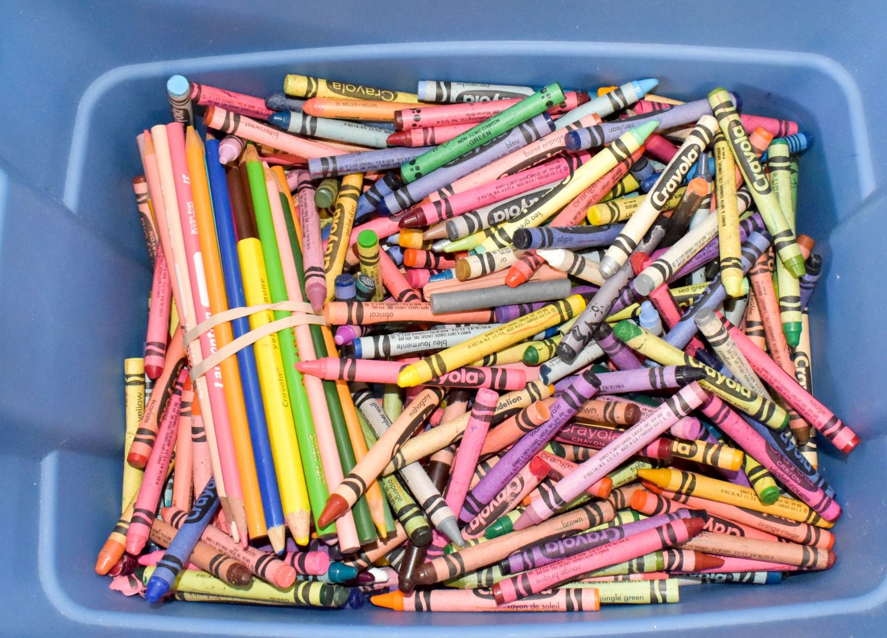 BIN OF WAX CRAYONS AND PENCIL CRAYONS