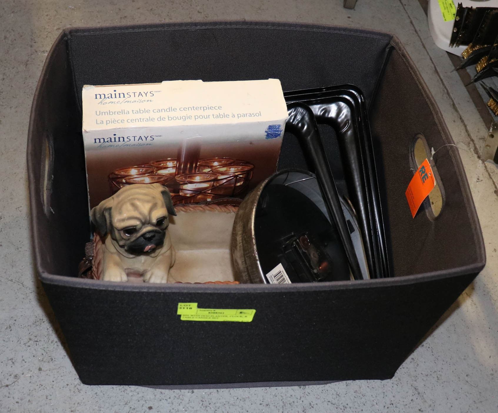 BIN WITH DOG PLANTER, CLOCK, & TABLE CANDLE SET