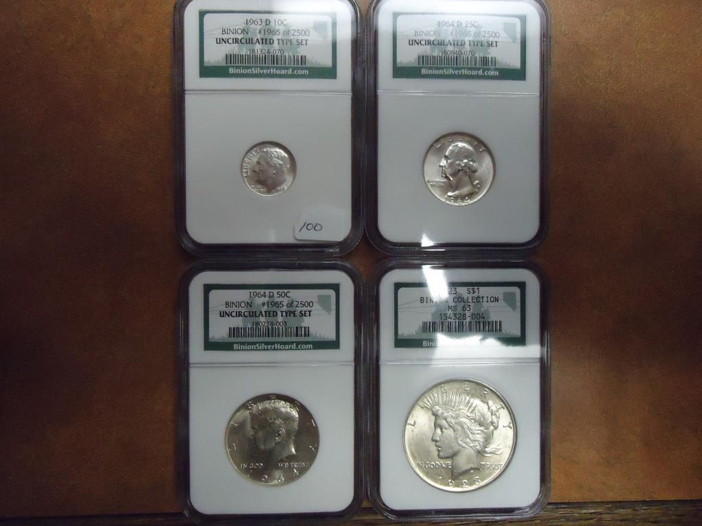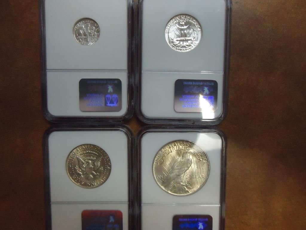 1963-D SILVER ROOSEVELT DIME NGC UNC, 1964-D  WASHINGTON SILVER QUARTER NGC UNC, 1964-D 90%  SILVER KENNEDY HALF DOLLAR NGC UNC AND 1923  PEACE SILVER DOLLAR NGC MS63