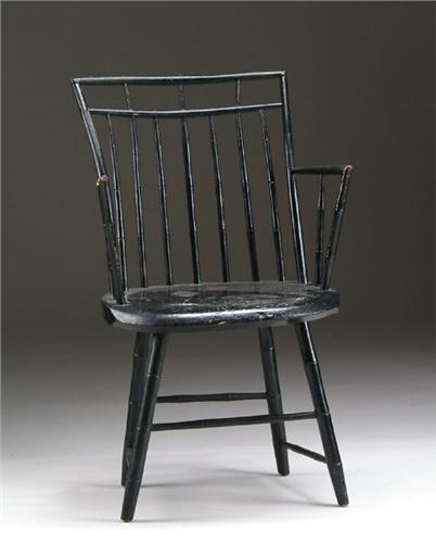 BIRDCAGE WINDSOR ARMCHAIR. Typical form, black paint with bamboo style turning. SIZE: 33in. h x 16in. seat h. CONDITION: Old paint has some alligatoring, some scarring to seat, otherwise very good. 9-26131