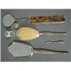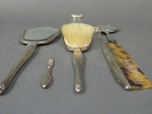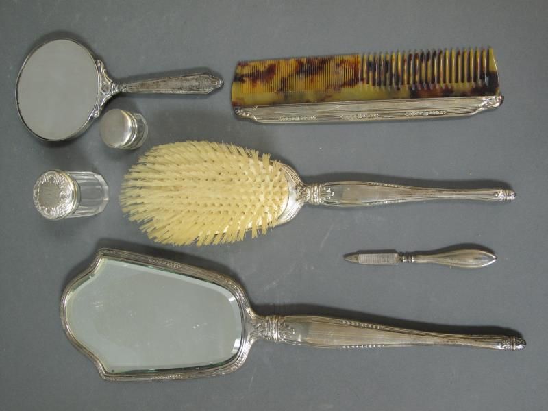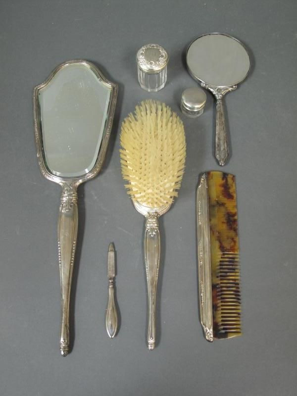 -comprised of shaped hand mirror, circular hand mirror, brush, tortoise shell comb. Together with two small sterling lidded jars.