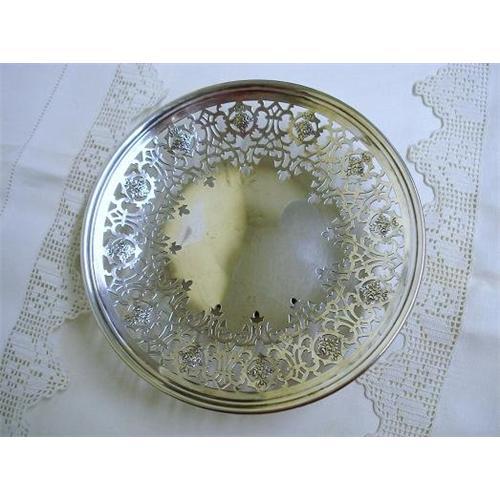 LOVELY, SILVER PLATED, FLORAL OPEN WORK CAKE STAND,MADE BY BIRKS - EP NS - BEAUTIFUL ITEM, IN EXCELLENT FOR IT'S AGE - USED CONDITION, SOME MARKS ON SILVER SURFACE SHOWING FROM THE USED, IT MIGHT CLEAN UP, WE DID NOT DO ANY POLISHING,MEASURES ABOUT 1 3/4 inch high, x 7 1/2 inch in diam, US Buyer to pay 8.00 for shipping plus insurance,THANKS.