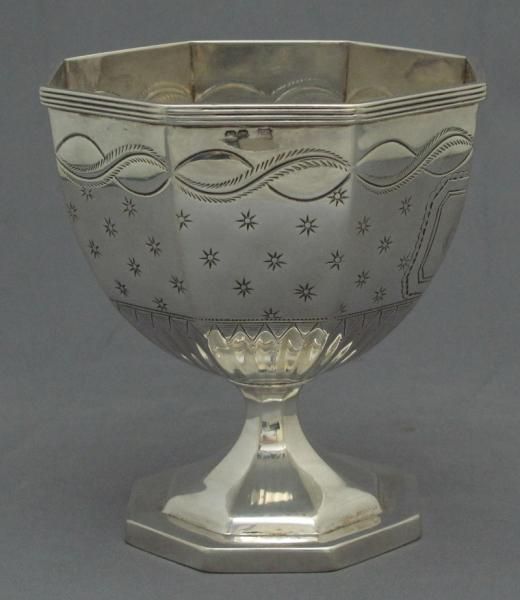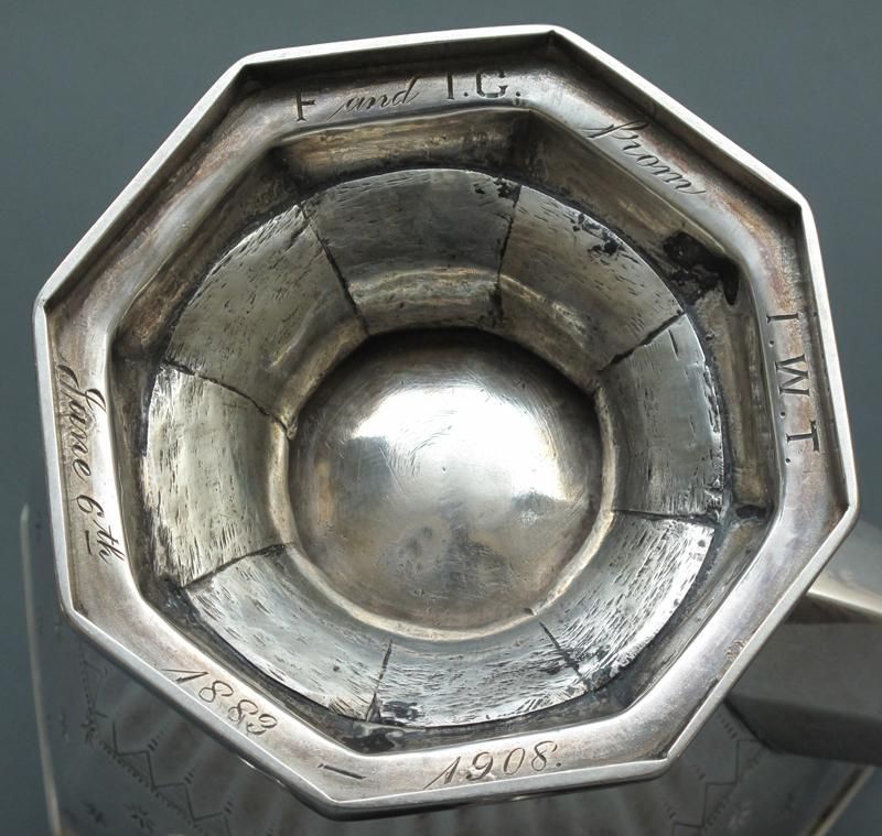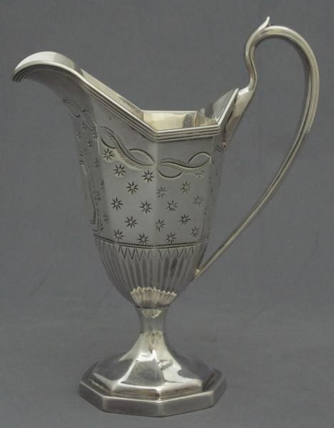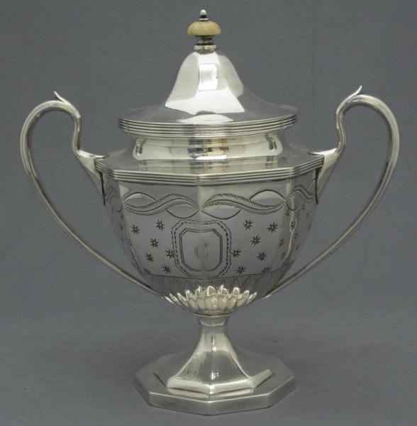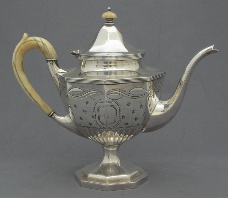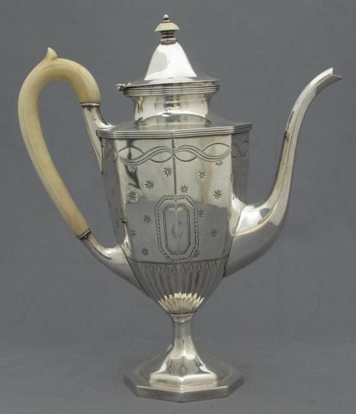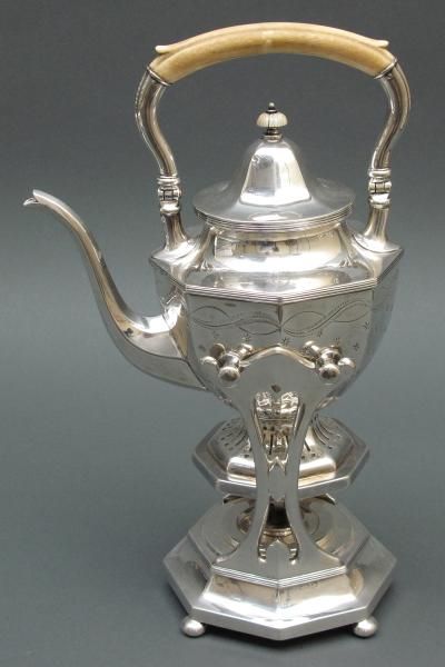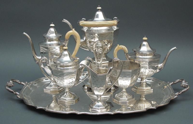 -eight piece service, circa 1908, comprised of double-handled tray, hot water kettle on stand, tea pot, coffee pot, lidded sugar, open sugar, cream.