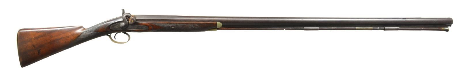 Cal. 8 Bore (.850"). NSN. Bbl. 48" rnd. w/ oct. shank of twist steel. Top flat is Birmingham marked w/ partially legible, that appears to start w/ "S" & ends in "FIELD". Unmarked island lock & percussion hammer w/ arabesque scroll engraving that continues to extended top tang. Half length straight grip walnut stock fastened by 2 bolts w/ iron escutcheons. Stock featured wrist & forearm w/ engraved brass trigger guard & German silver nose cap having German silver presentation plate in toeline. LOP: 14 1/8" over brass shotgun butt. Brass tipped hardwood ramrod held on iron under rib by a faceted brass thimble & 2 plain iron pipes. Weight: 14 lbs. CONDITION: metal finish has faded to brown patina showing visible twist pattern w/ spots of pitting that is heaviest in breech area. Stock has dark worn appearance w/ dents & handling marks having cracks & chips at lock & sideplate areas. Modern replacement nipple. Ramrod shows lg. chips w/ brass & wrapped repairs. Sound lock. Dark pitted bore. (01-18085/DS). ANTIQUE. $700-1,000.