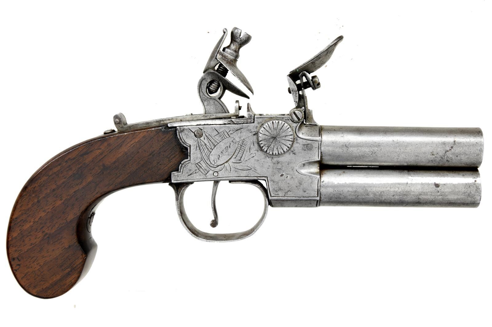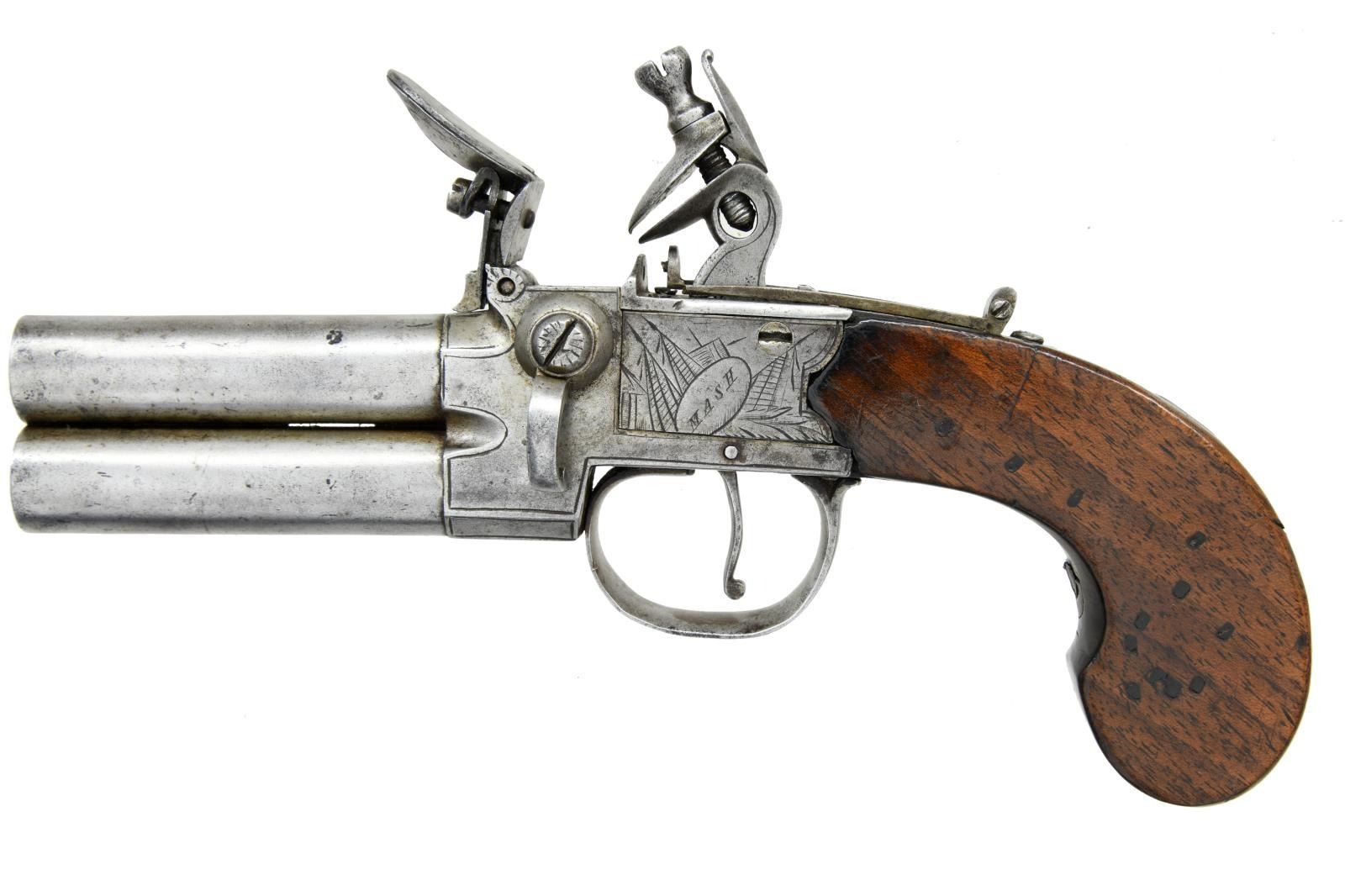 OF LONDON. Cal. 45. NSN. An early 19th century pistol w/ 2 5/8" bbls. w/ muzzle having notches to seat ball. Birmingham "crossed scepters" proofs on bbl. & bottom of boxlock. Sides of receiver have light patriotic themed engraving marked "LONDON" on right side & "MASH" on left side. Center mounted hammer has half cock setting for sliding safety; missing flint. Left side has rotary tap for determining bbl. designation. Conventional trigger. Walnut flat sided bag type grip w/ shield plate. CONDITION: metal has gray/brown patina appearance w/ light marks & pitting. Grip has good varnish showing impressions, wood chips around action & sm. cracks. Bottom tang has crack through screw. Good smooth bores w/ pitting. Missing flint. Action appears functional when cycled by hand. (01-23455/MD). ANTIQUE. $500-750.