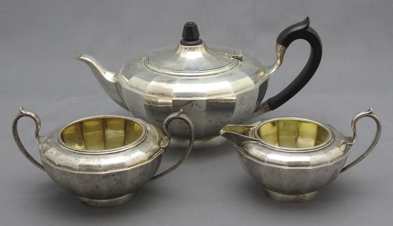 Three piece (.925) service comprised of teapot, open sugar and creamer. Each of simple faceted design. Fully marked.