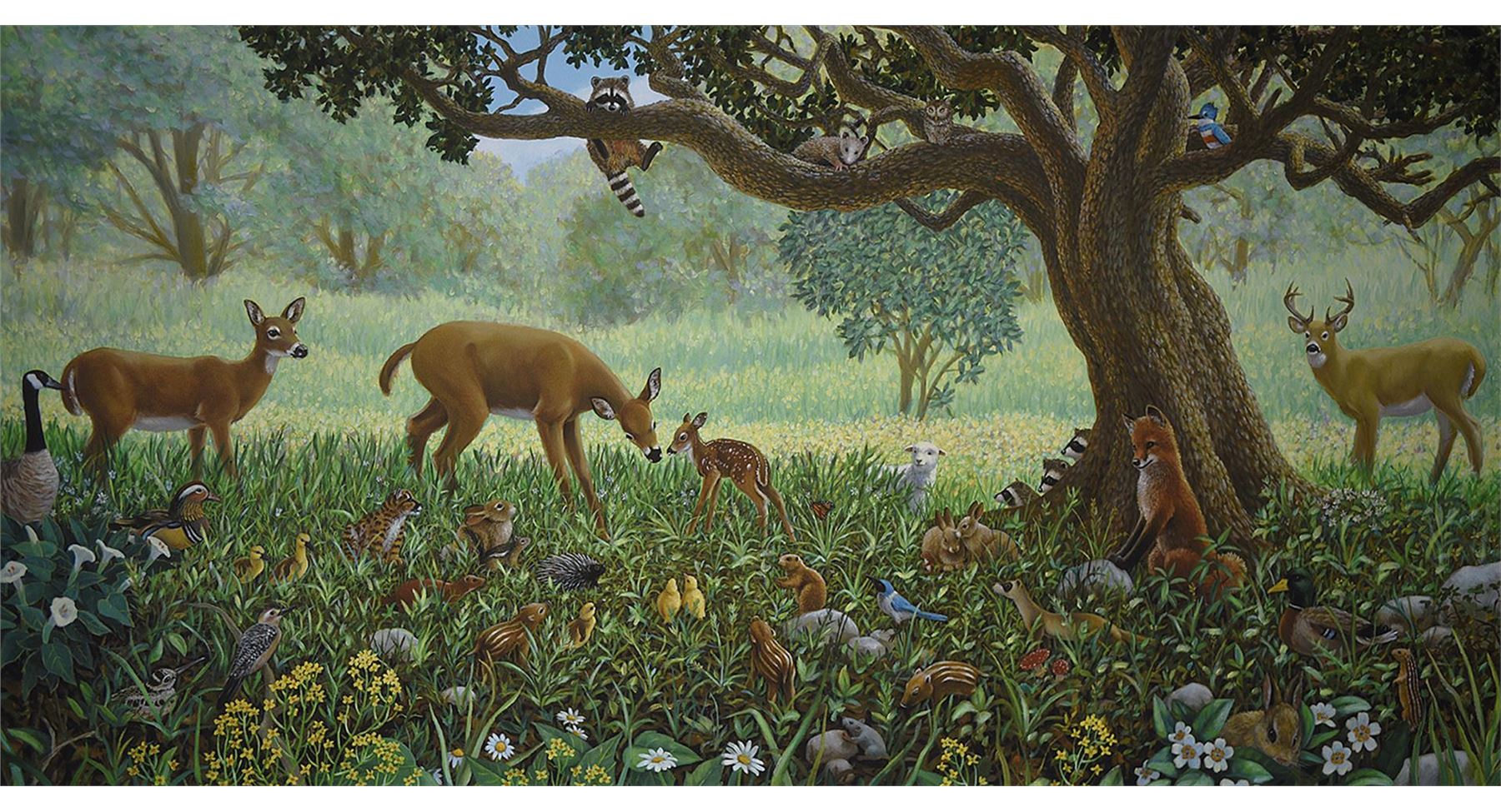 Giclee on paper, limited edition by Charles Lynn Bragg. All the Forest Creatures, large and small, gather to watch a new born take its first steps. 32 x 16