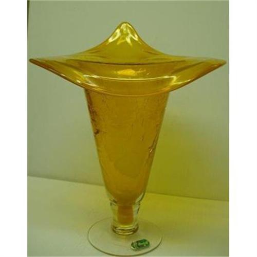 WONDERFUL STUDIO SIZE - HUGE - HONEY-CARAMEL COLOR VASE, HAND CRAFTED BY BISCHOFF GLASS, THIS IS "JACK-IN-PULPIT" CRACKLE STYLE VASE, DEPICTING PONTIL MARK ON THE BOTTOM,ORIGINAL PAPER LABEL AND THERE IS A NUMBER? IMPRESSED IN THE GLASS AT THE VERY TIP-POINT OF THE VASE, LOVE THE WARM LIGHT CARAMEL ALMOST ORANG-Y COLOR, IT IS VERY HEAVY AND IT STANDS 11 3/4" AT THE HIGHEST POINT AND TOP MEASURES `0 1/4" X 9 1/4" IN DIAMETER.EXCELLENT,MINT CONDITION FREE OF DAMAGE,US BUYER TO PAY 12.00 (heavy) FOR SHIPPING PLUS INSURANCE.THANKS.