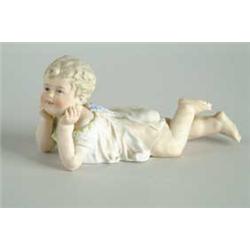 Lot 01461A. BISQUE PIANO BABY. Baby is laying down with hands under head. Impressed mark “484”. SIZE: 8” l. CONDITION: Very good. 9-96616 (150-250)