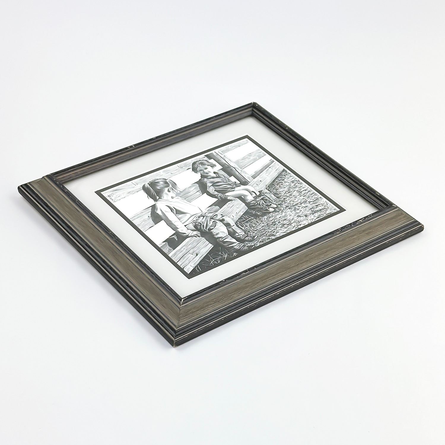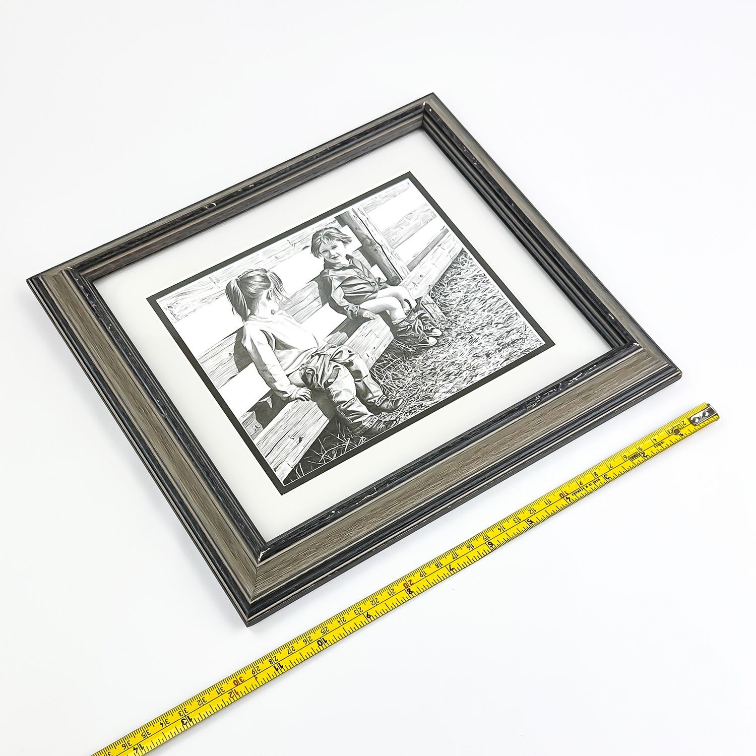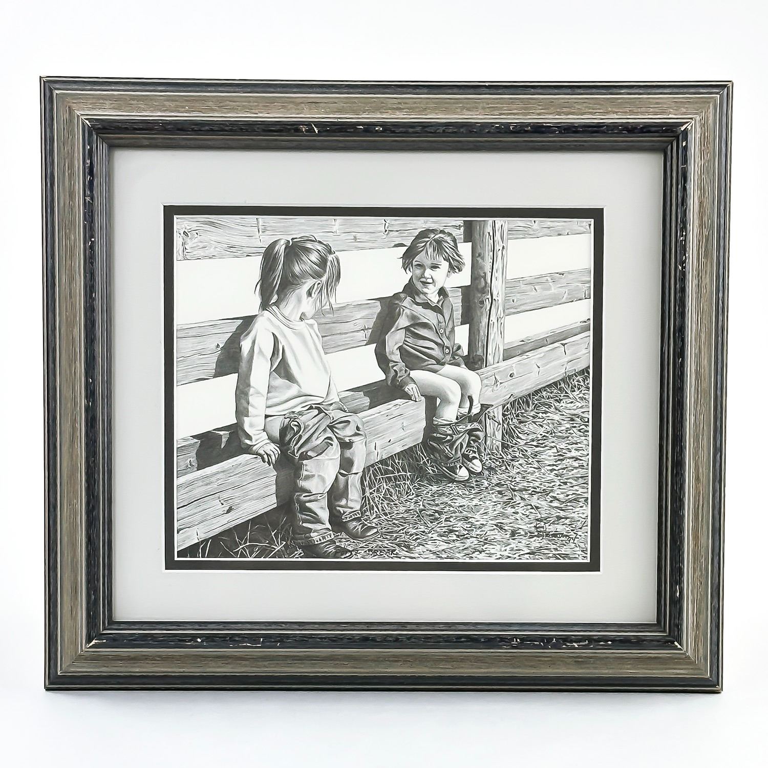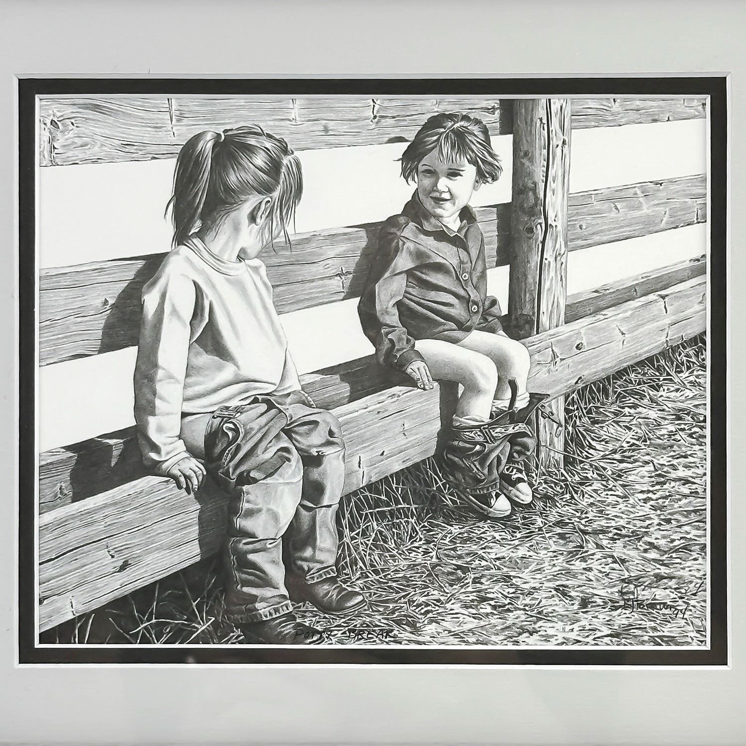#8016 - BJ BROWN (BERNIE BROWN) - ALBERTA, CANADA PENCIL ARTIST. IMAGE TITLED “POTTY BREAK” - FRAMED AND MATTED UNDER GLASS. HOME OR OFFICE WALL DECOR - GIRLS ON THE FARM ART PICTURE. FRAME SIZE MEASURES 10” X 11”