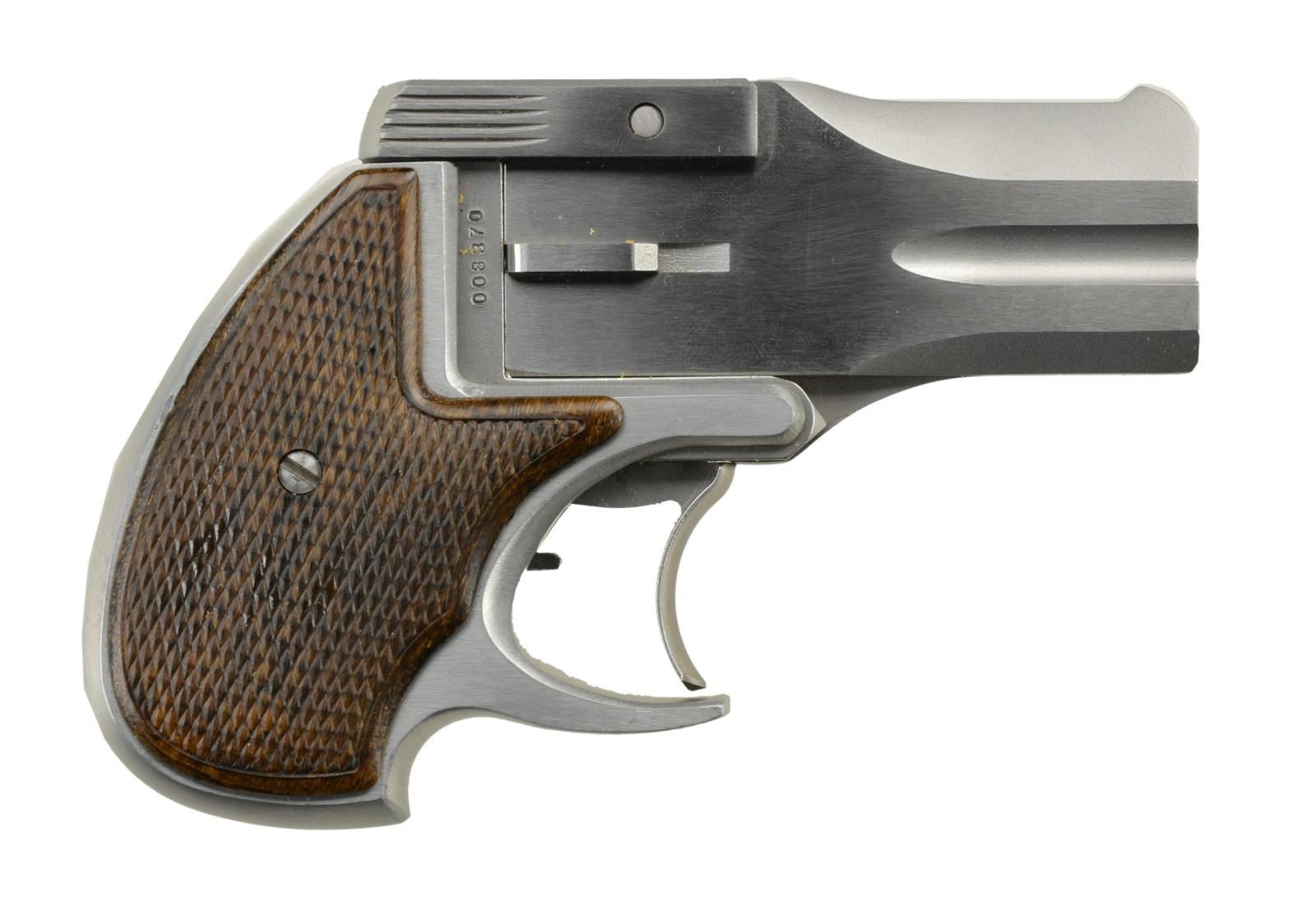 Cal. 38 Special. S# 008370 Bbl. 3" Stainless steel double barrels & aluminum frame. Single trigger w/ no exposed hammer. Top-strap lock / extractor. Left side sliding safety. Brown checkered grips. Fixed sights. UNATTACHED ACCESSORIES: Original silver cardboard box w/ red, fitted insert & paperwork. CONDITION: Exterior surfaces largely unblemished aside from some light staining on grip edge of frame. Checkered grips illustrate no wear. Bright bore w/ sharp rifling. (22-2437/JZ). MODERN. $100-200