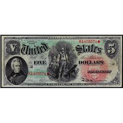 One 1869 $5 Rainbow Woodchopper Legal Tender Note.