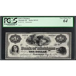 One 1852 $1 Bank of Michigan Marshall Obsolete Bank Note PCGS Very Choice New 64. PCGS Graded.
