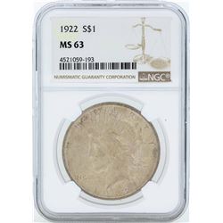 1922 $1 Peace Silver Dollar Coin NGC MS63
