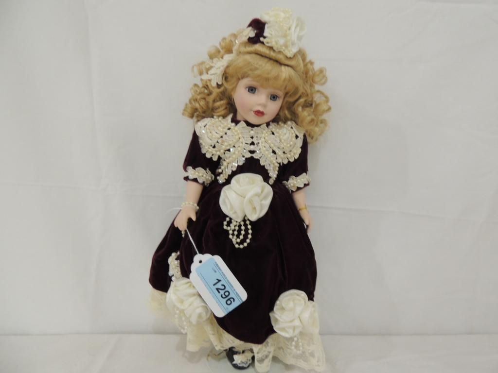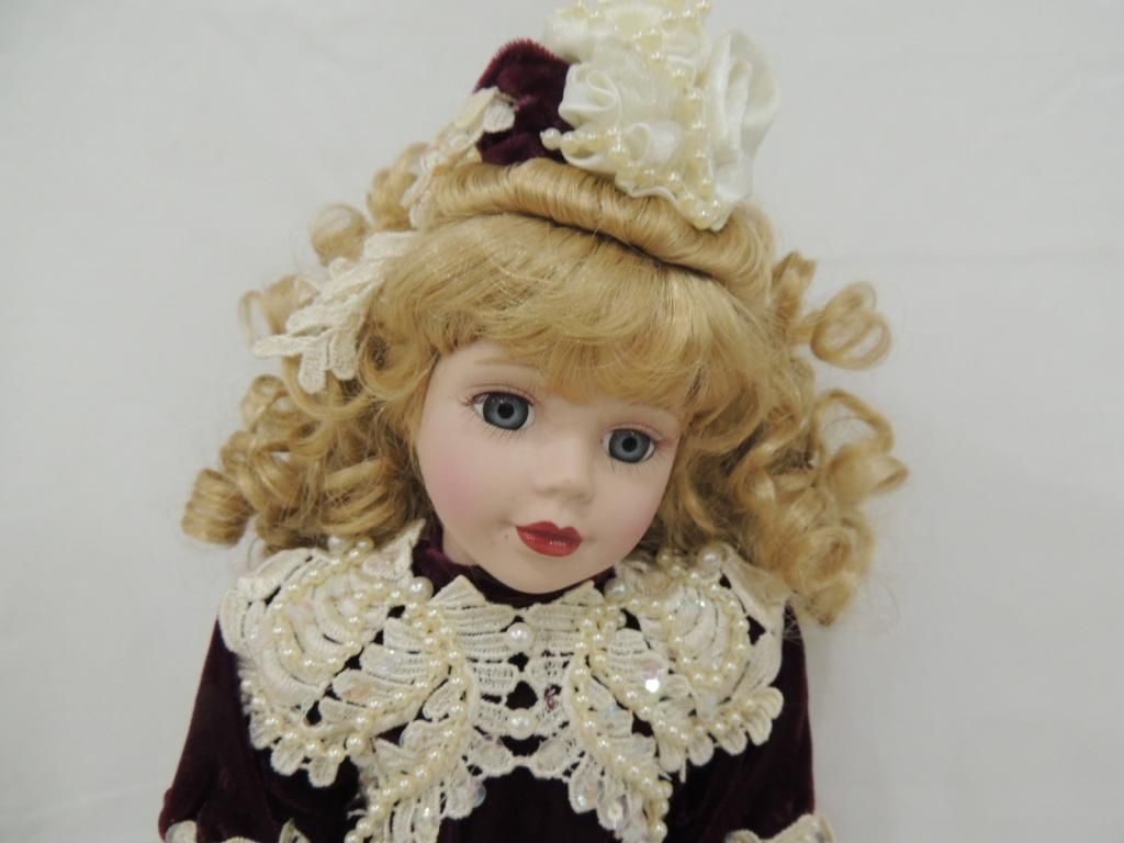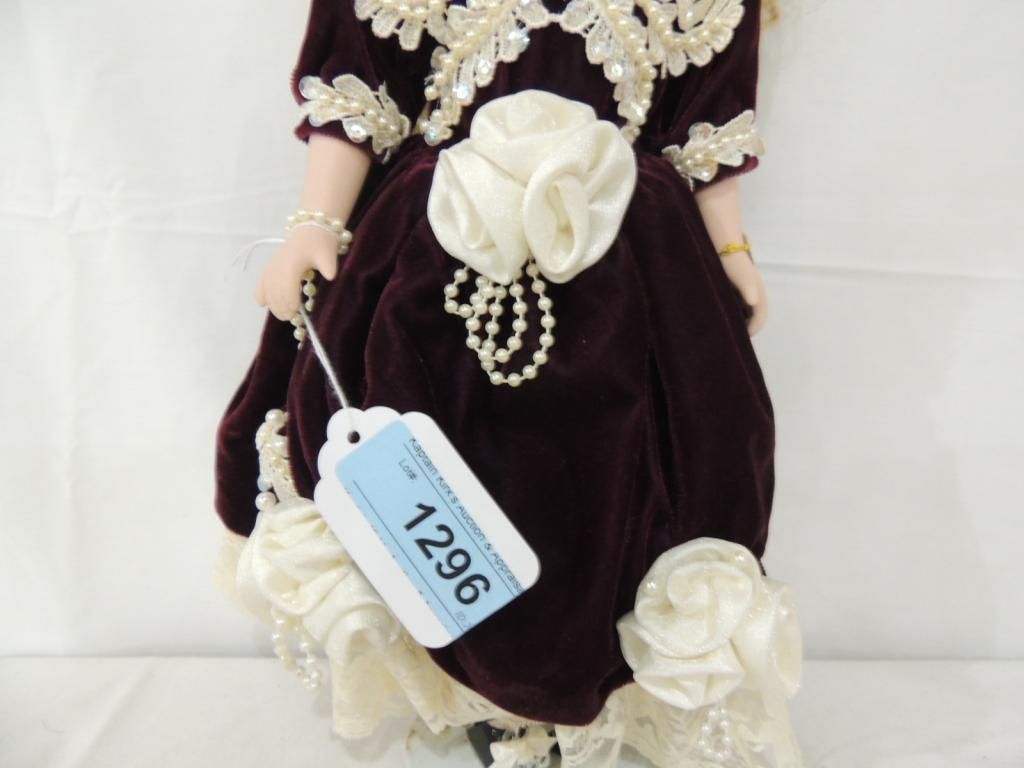 GENUINE PORCELAIN DOLL BY MELINE JANE BK BRASS KEY. VICTORIAN COLLECTION WITH STAND 17" TALL AS SHOWN. SEE PHOTO FOR MORE DETAILS.