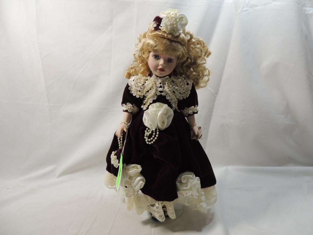 GENUINE PORCELAIN DOLL BY MELINE JANE BK BRASS KEY. VICTORIAN COLLECTION WITH STAND 17" TALL AS SHOWN. SEE PHOTO FOR MORE DETAILS.
