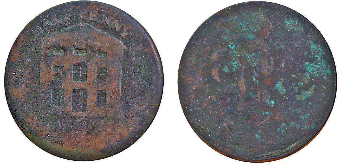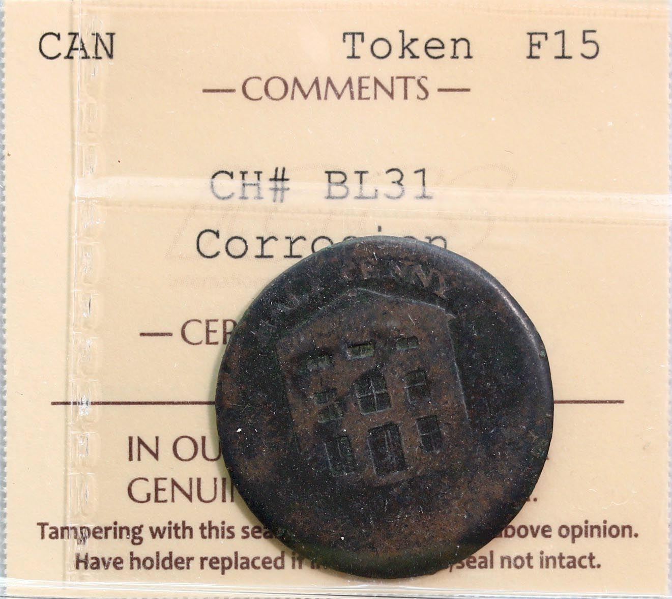 BL-31, Co360NS, JB Warehouse 1/2 Penny Token - Warehouse ICCS F-15 deisgnated with corrosion.
