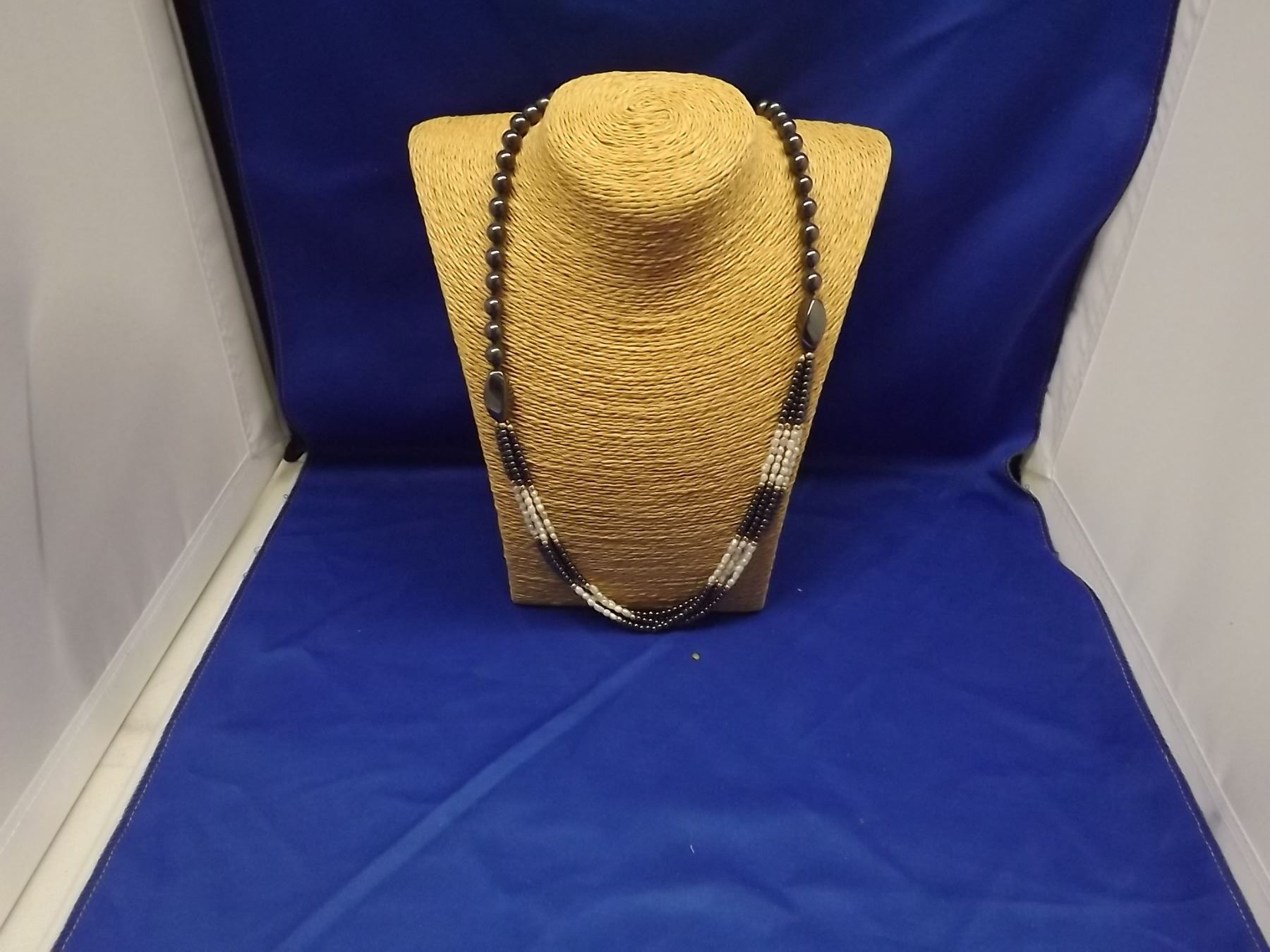 BLACK ALASKAN AND WHITE FRESH WATER PEARL NECKLACE WITH BLACK AND GOLD BEADS