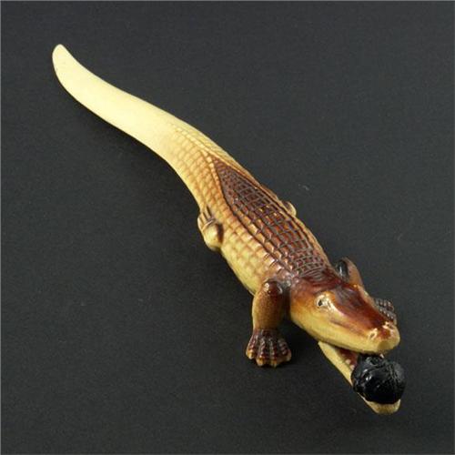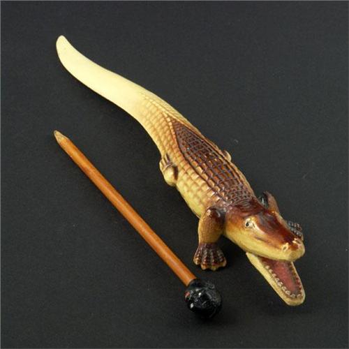 BLACK AMERICANA: An early celluloid pencil holder in the form of an alligator ''swallowing'' a pencil with the tip in the form of a head of a black man. Measures 8 1/2''L. Good condition with all of the teeth present.
