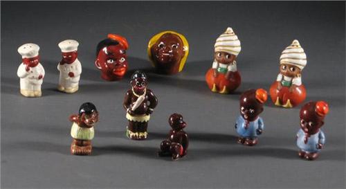 Black Americana ceramic shakers to include eleven shakers in various shapes and sizes, some marked Japan examples; chips and imperfections to all. 4.5'' x 2.25''