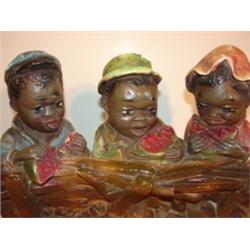 BLACK AMERICANA CHALKWARE STATUETTE of three African-American children eating watermelon. Small amount of flaking and minimal chipping to paint. Good overall condition. 11" H, 16.5" W