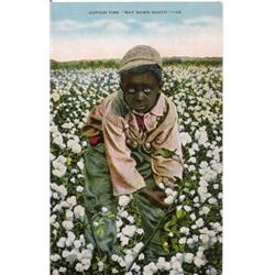 Black Americana postcard featuring a black youth in a cotton field. Titled "Come to See Me, Down in Sunny Dixie". 1953 postmark on reverse.