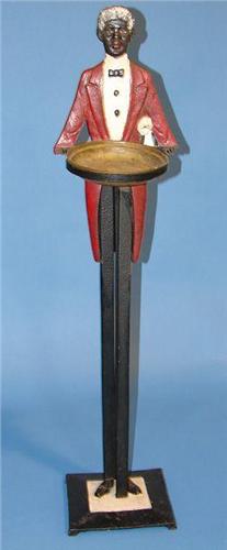 FIGURAL CAST-IRON BLACK AMERICANA DUMB WAITER. In the form of an African American gentleman holding a tray. 35” H