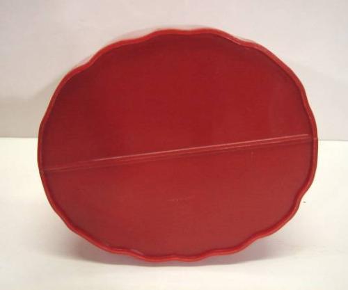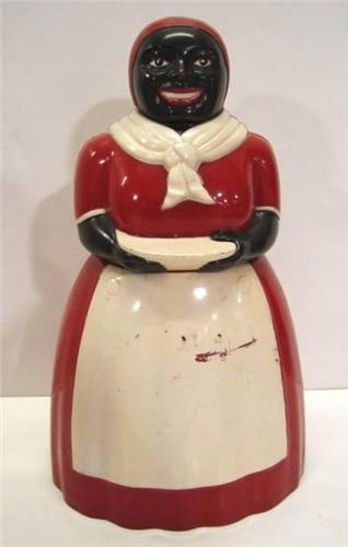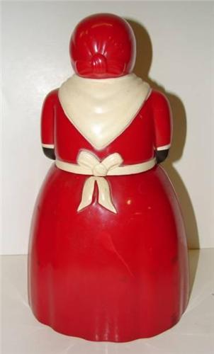 BLACK AMERICANA PLASTIC MAMMY COOKIE JAR. Red outfit. Marked on bottom “F. & F. Mold & Die Works/Dayton, Ohio/Made in U.S.A.” Shows minor loss to paint at apron. 11.5” H