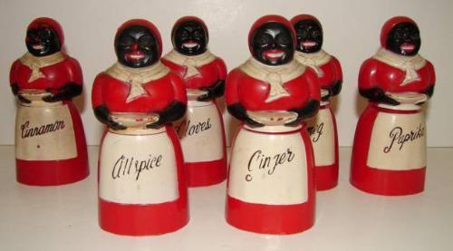 BLACK AMERICANA MAMMY PLASTIC 6 PIECE SPICE SET. All are marked on bottom “Aunt Jemima/F. & F. Mold & Die Works/Dayton, Ohio/Made in U.S.A.” Consists of allspice, cinnamon, cloves, ginger, paprika, & nutmeg. Some pieces show minor loss to paint. 4” H