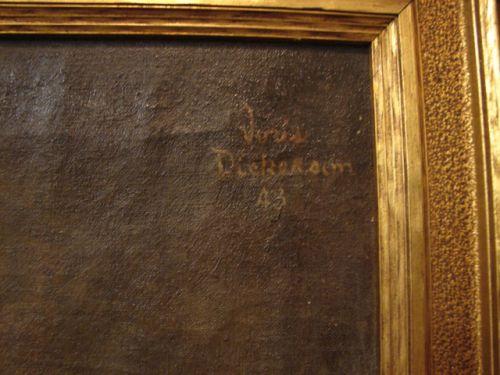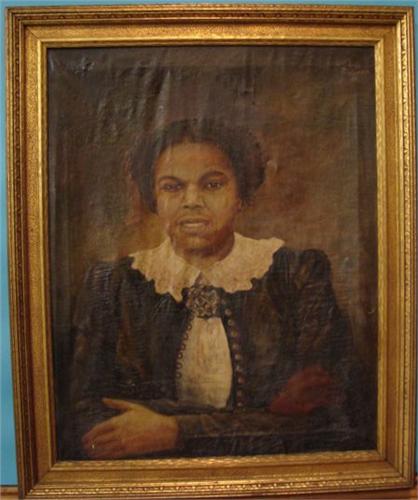 BLACK AMERICANA OIL ON CANVAS PAINTING. Depicts a young African-American female in 19th century clothing. Signed in upper right “Doris Dickerson/’43”. Painting shows craquelure throughout. Painting rests in gilt wood frame. 35.5” x 29.5” framed