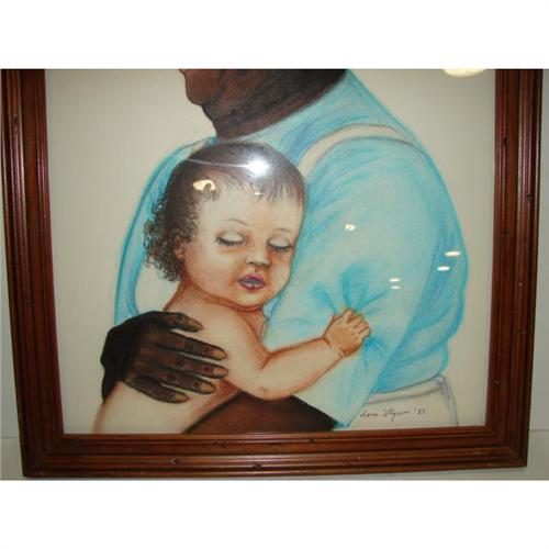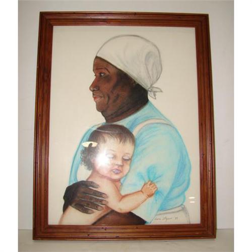 20TH CENTURY BLACK AMERICANA PAINTING. Pastel on paper. Depicts an African-American woman with bandana holding an infant. Signed in lower right “Lora Styer/’83”. 21” x 16” framed.