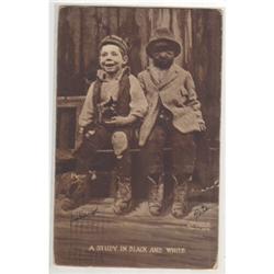 BLACK AMERICANA POSTCARD. Depicts white & African-American youths. Titled "A Study in Black & White". Published by M.T. Sheahan, Boston. 1909 postmark.