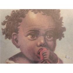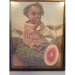 Black Americana print of child and watermelon. Child is seated on watermelon. 12" x 15" framed.
