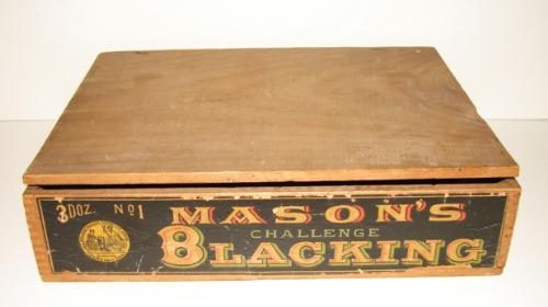 BLACK AMERICANA SHOE SHINE BOX. Wooden dovetailed box with lid has applied lithograph label at front that reads “Mason’s/Challenge/Blacking/3 Doz. No. 1” and applied lithograph label on inside of lid that shows an African American shining boots while a boy and dog watch. 2.75” H, 10.5” L, 8” D