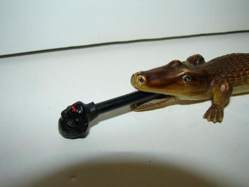 BLACK AMERICANA ADVERTISING SOUVENIR PENCIL AND HOLDER. Holder is in the form of a plastic alligator with text on tail that reads “New Roma/Italian Restaurant/117 N. Clark St.” Pencil has an African-American boy’s head at top. Alligator shows some damage at jaw. 8” L