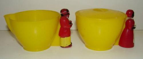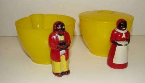 BLACK AMERICANA PLASTIC SUGAR & CREAMER. Consists of a creamer with small figure of Uncle Mose and a sugar dish with a small figure of Aunt Jemima. Both show loss to paint. Marked on bottom “F. & F. Mold & Die Works/Dayton, Ohio/Made in U.S.A.” 2” H