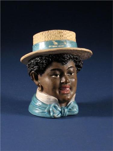 HUMIDOR: A Black Americana earthenware tobacco jar/ humidor, a smiling black man in a straw hat, stamped ''BB, DEP(in circle), 338'' on underside, Minton earthenware (?), some flaws to paint (hat band, teeth, collar), 6 3/4'' x 4 1/2'', no chips or cracks noted.